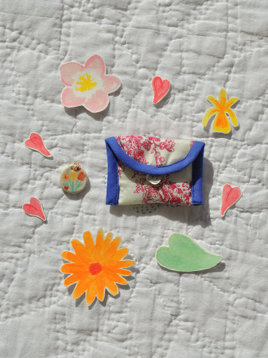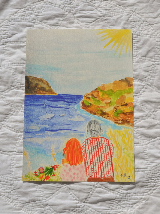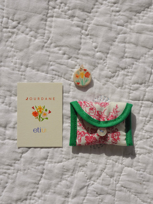 Une médaille en céramique peinte à la main, une pochette faite de tissus anciens pour venir l'envelopper et une aquarelle qui capture un moment de douceur avec elle.