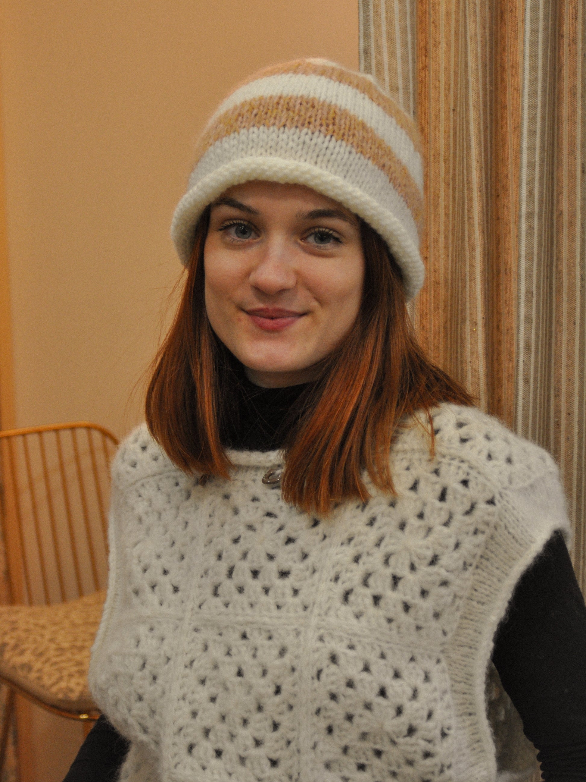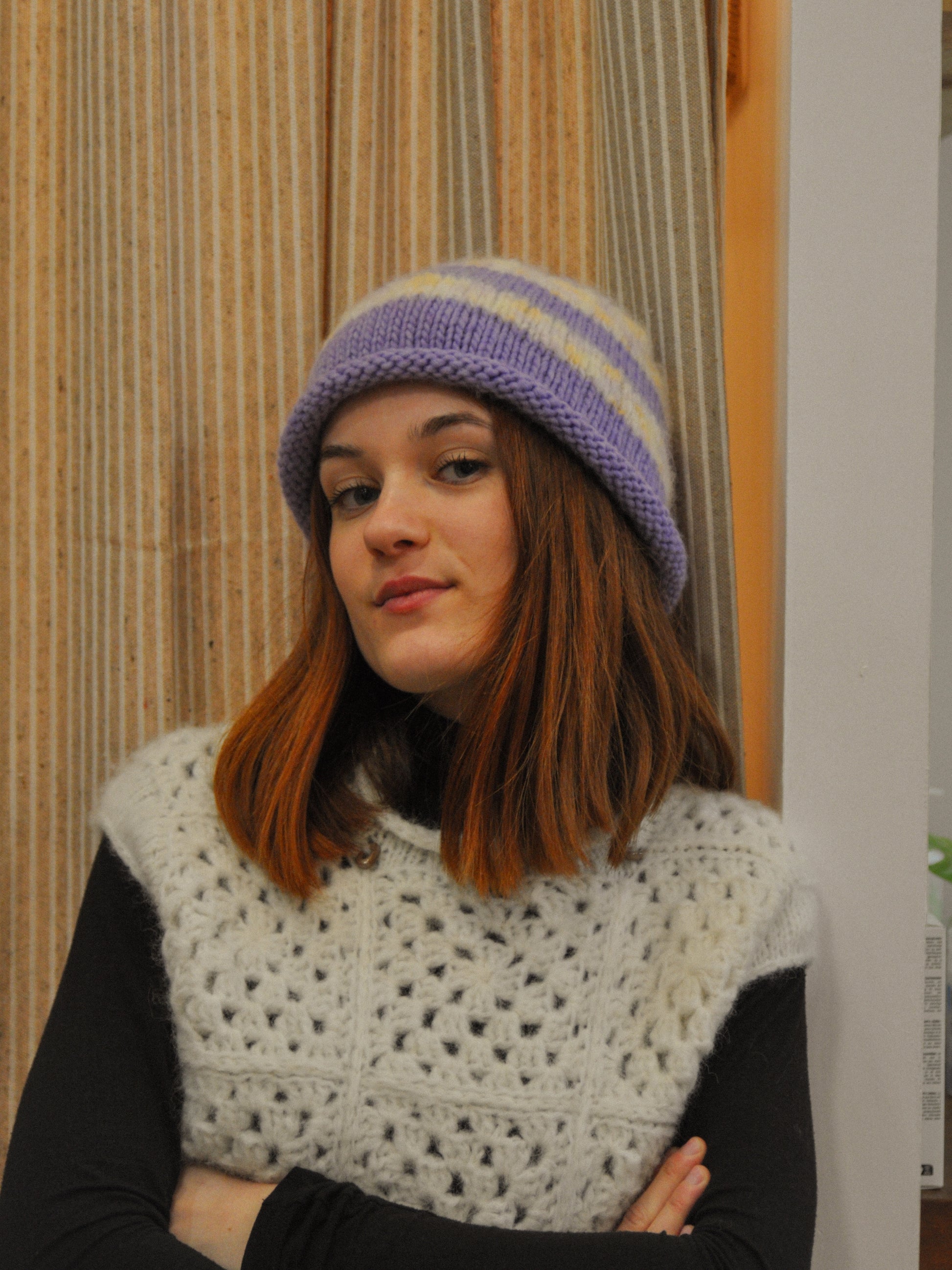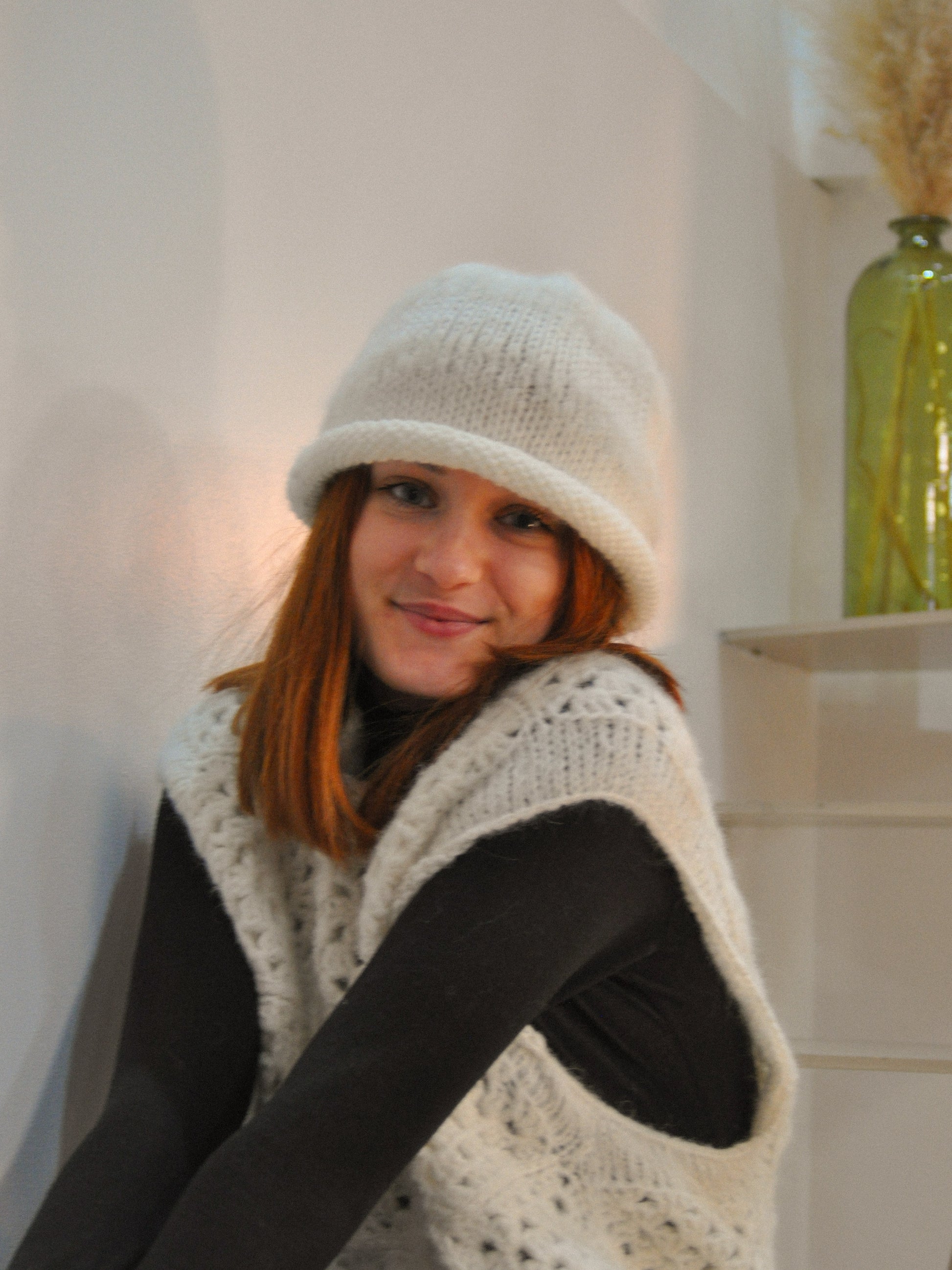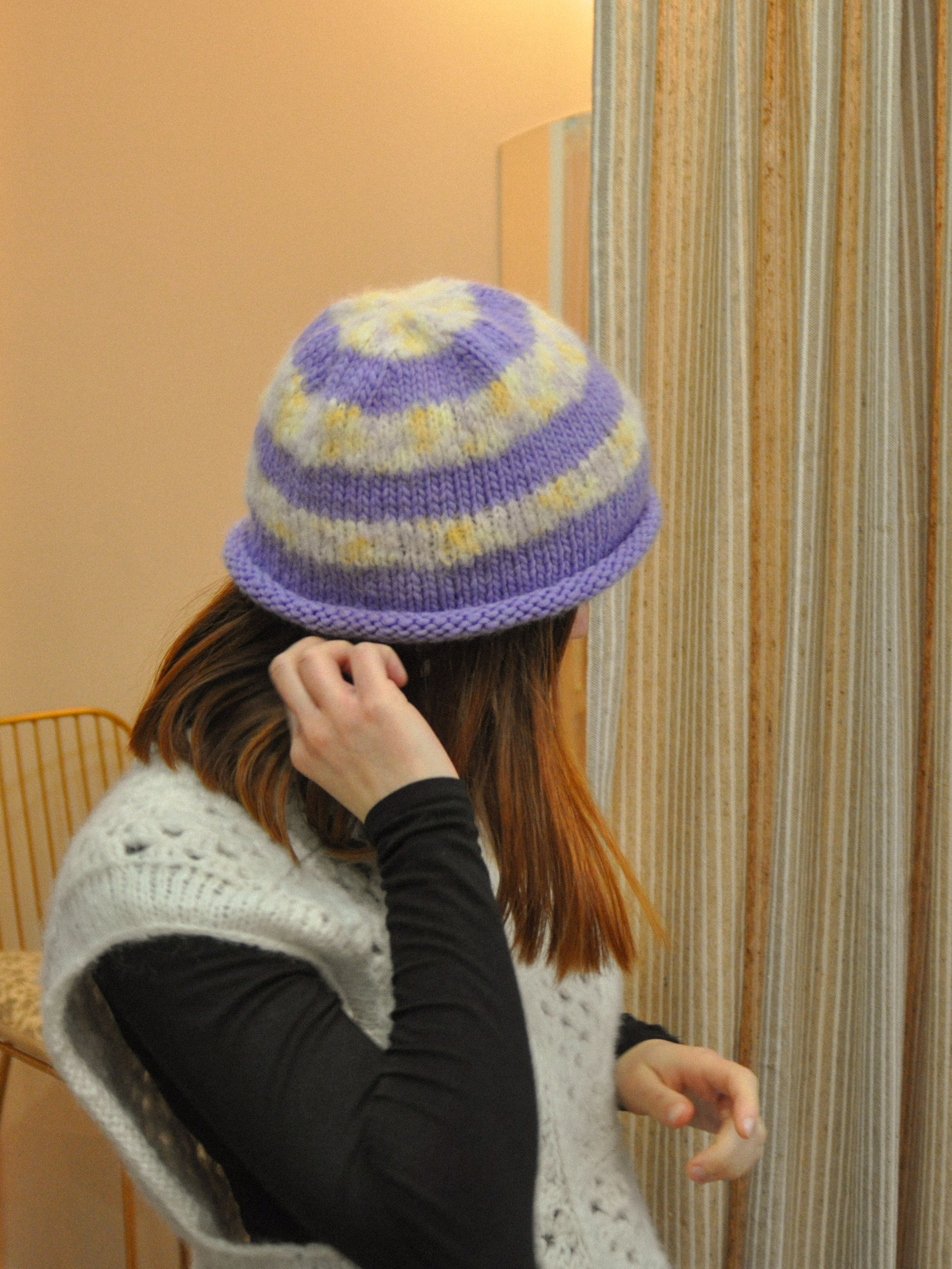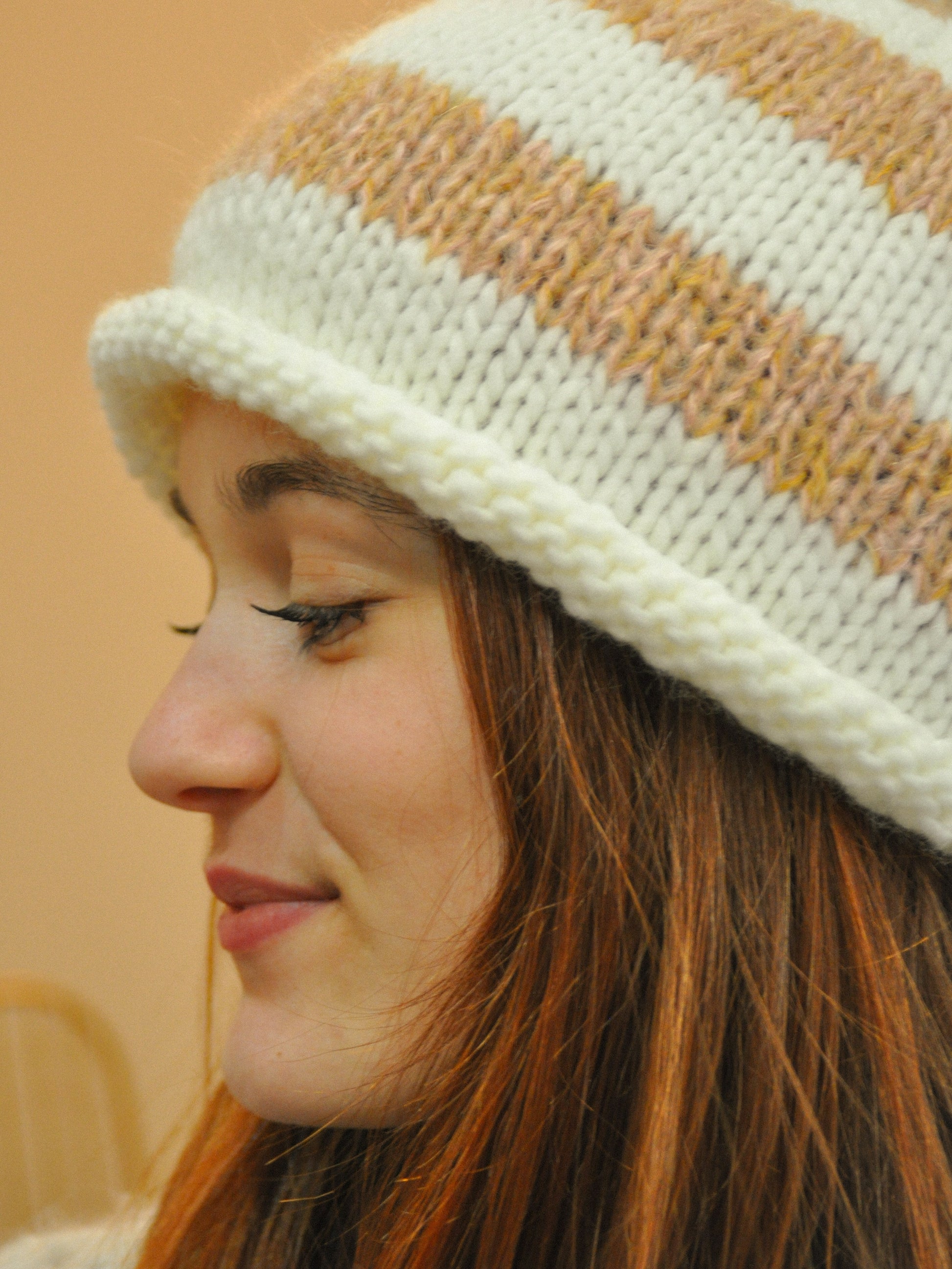 Le Bonnet Linea est tricoté à la main alternant un fil uni en Laine vierge et un fil en Alpaga duveteux.